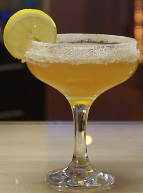 Glassets kant er gnedet med citron­ eller anden citrussaft og dyppet i melis,