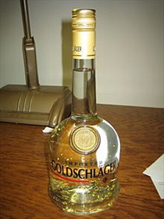 Goldschläger is an Italian cinnamon schnapps (43.5% alcohol by volume or 87 proof; originally it was 53.5% alcohol or 107 proof), a clear liqueur with very thin, yet visible flakes of gold leaf floating in it. The actual amount of gold is extremely small and serves as a sort of novelty: there is currently less than a tenth of a gram (0.1 g) of gold flakes in a 750 ml bottle of Goldschläger, which, as of July 9, 2008, amounts to about 3.00 USD on the international gold market.