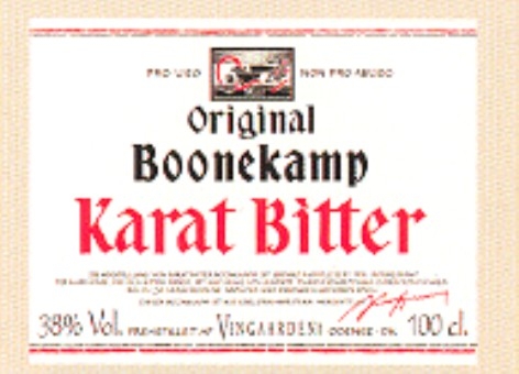 38%, En boonekamp-type, dvs. en mavebitter, som oprindeligt blev fremstillet i Antwerpen i Belgien. Karat Bitter blev lanceret i Danmark i 50'erne efter en tysk opskrift af vinfirma et Knud Jørgensen, Hellerup, som fremstillede den på gamle portvinspiber. Blandt de op mod 50 ingredienser - droger og urter - er de typiske for en boonekamp-type: kalmusrod, rabarberrad, galangarod og lakridsrod. Det giver en transparent lyst brun bitter med let sødme, rund og lakrids i eftersmagen.