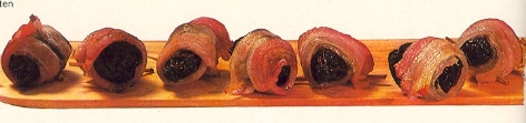 Rul 1/2 skive bacon om hver sveske og sæt en tandstikker i.