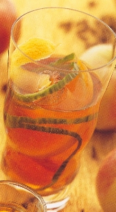 Server drinken i afkølede glas og pynt med frugten samt agurkespiralen.