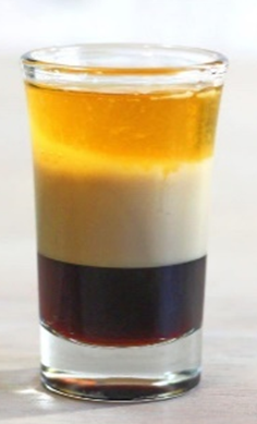 Læg de 3 ingredienser i lag (over bagsiden af spiseske) i shot glas.