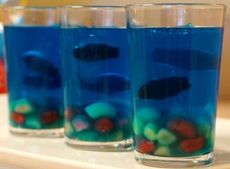 Afkøl indtil halvt stivnet, og tilsæt derefter løv og fisk, og hæld i drikkeglas.