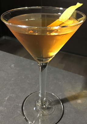 Rystes med is, sies og serveres i cocktailglas med et stykke citronskal.