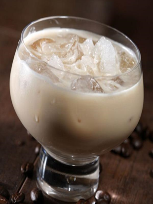 Rør Kahlua og kold mælk med is og og hæld i et kølet cocktailglas.
