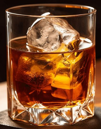 Fyld et whiskyglas med Crown  Royal over isterninger.