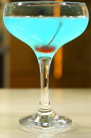 Ryst alle ingredienser med is, sigt over i et cocktailglas og server.