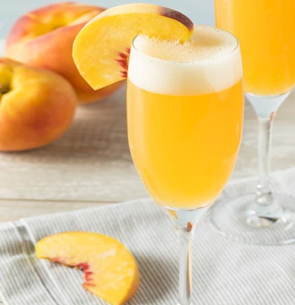 Hæld mangopuré i glas og tilsæt langsomt champagne.