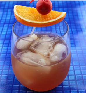 Ryst godt. Hæld i et lowball glas. Pynt med appelsinskive og kirsebær.
