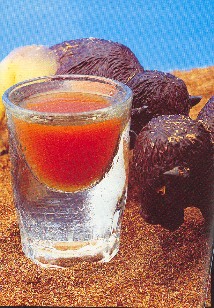 Skænk rommen i et shotglas og pres lidt saft over.