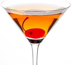 Ryst godt. Si over i et cocktailglas og pynt med kirsebær.