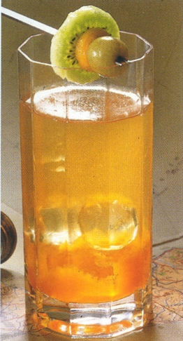 Whisky, sirup, saft og angostura tilsættes og omrøres kort.
