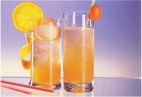 De to slags saft og Bacardi Lemon røres sammen og hældes i et longdrinkglas,