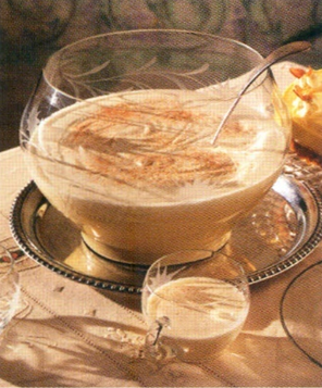 Hældes i en bowle og pyntes med muskatnød .