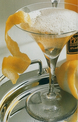 Likør og frugtsnaps røres sammen i et coupeglas.