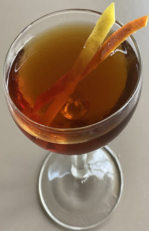 Rystes med is og serveres i cocktailglas med citron- og appelsinskal presset over.