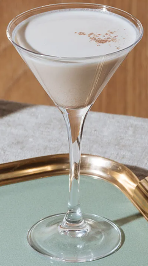 Ryst godt, si over i et cocktailglas og drys med revet muskatnød.