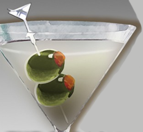 Tag cocktailglasset ud af fryseren, tøm, si drikken i cocktailglasset tilsæt oliven fra røremaskinen.