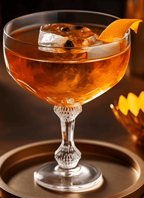 Alle ingredienser, bortset fra appelsinskal og citronskiver, hældes i et mixerglas og røres godt om.