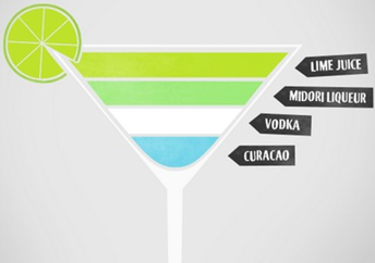 Lægges i lag i nævnte rækkefølge i cocktailglas.
