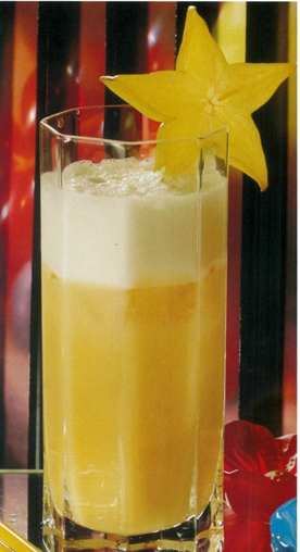 Pyntes med stjernefrugtskive og serveres med sugerør.