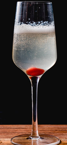 Serveres med et rødt cocktailbær og et evt sugerør.