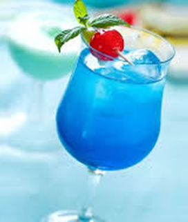 Is, gin, curaçao og saft hældes i et coupeglas.