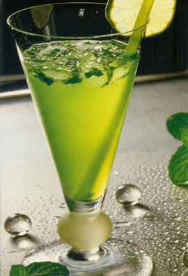 Pebermynte- og sukker-sirup samt citronsaft tilsættes.