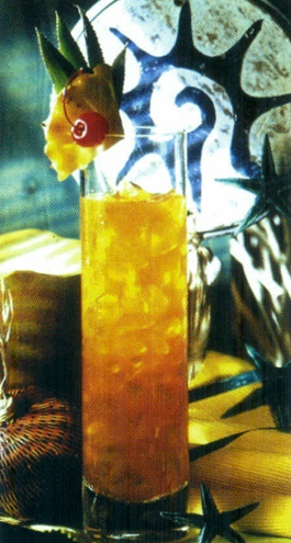 Hældes i et longdrinkglas halvt fyldt op med knust is.