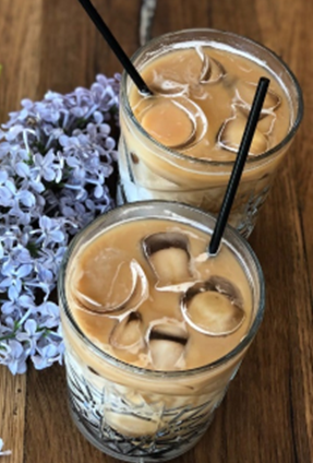 Pulverkaffe røres sammen med kold mælk, fløde og rom.