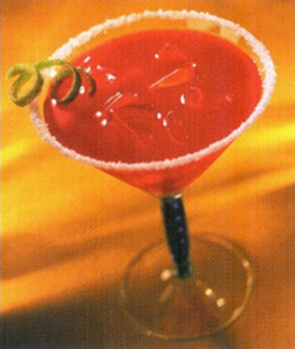 Hældes gennem si i et cocktailglas med sukkerrand.
