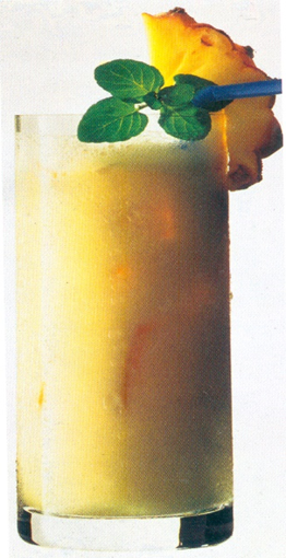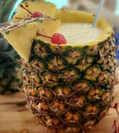 den serveres i en udhulet ananas.