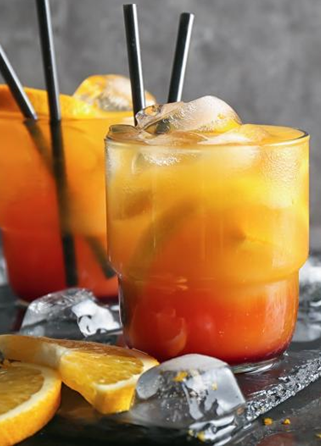 og skænk drinken i et højt glas. Tilsæt mørk rom.