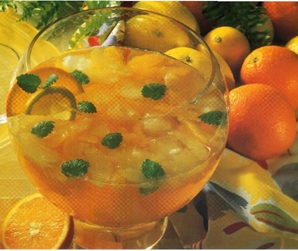 Frugtbåde og saft kommes i en punchebowle.
