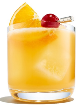 Whisky, saft og sirup rystes sammen med is i en shaker.