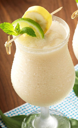 Skænk i et afkølet glas og pynt med limeskive og bananskive.
