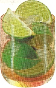 Sukkeret hældes i et stort rockglas. Limefrugterne deles i kvarte,