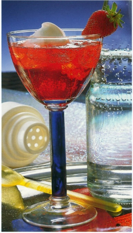 Hældes gennem barsi i et dybt, bredt cocktailglas.