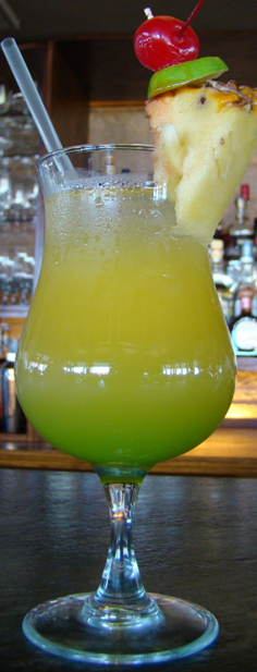 Pynt med et stykke ananas, et kirsebær og et stykke selleri.