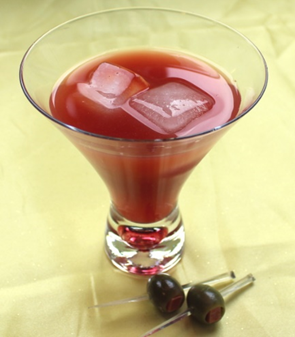 Kom alle ingredienser i en shaker, undtagen oliven, og ryst, indtil shakeren er frostet.